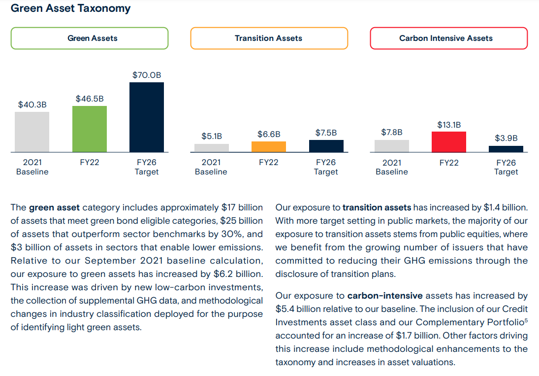 PSP provided further details of its Green Asset Taxonomy (GAT), indicating that the GAT “considers the two key variables of climate investing – carbon intensity and the credibility of a company’s climate transition plan” (RI Report, p.12). PSP says “A key objective in developing the PSP Investments Green Asset Taxonomy was to design a pragmatic framework to helps us to better understand our baseline exposure to systemic climate risks and opportunities across our investment portfolio, and to aid us in identifying potential ways to steer our engagements with portfolio companies (where appropriate) toward more relevant decarbonization opportunities” (GAT p.4). PSP says it has also used the taxonomy to “screen investments” and inform its climate investment decision-making at the asset, asset class and portfolio level.