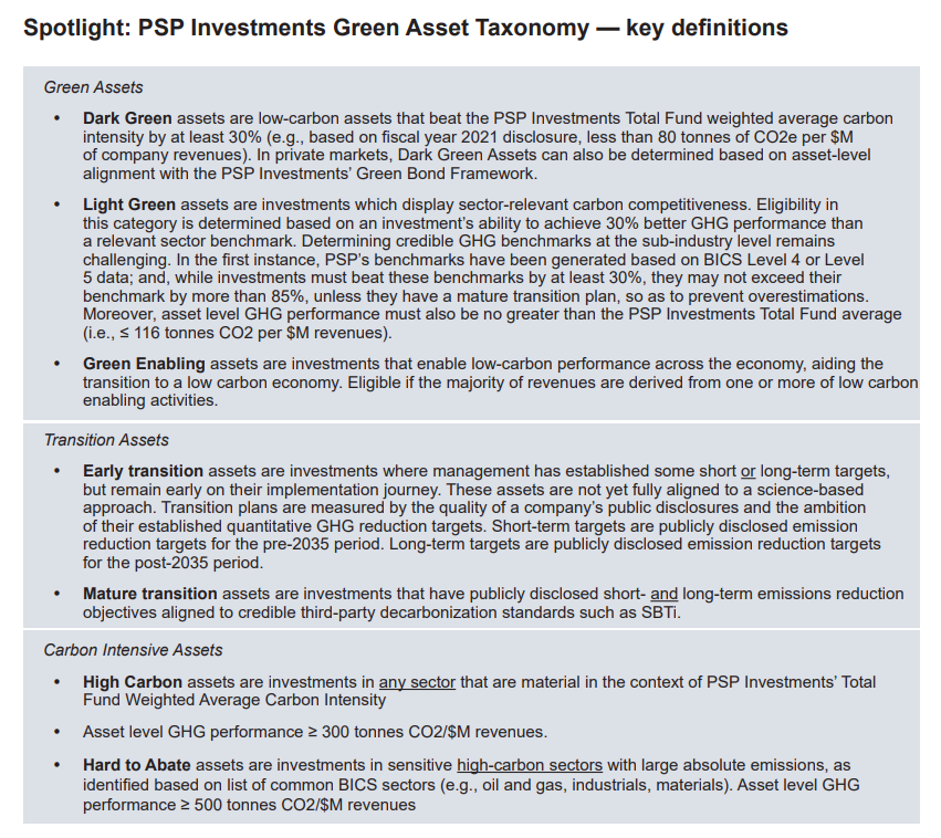 Image: PSP Investments Green Asset Taxonomy: Advancing Climate-Aligned Portfolio Management. (November 2022-), p.12. (Highlights added).