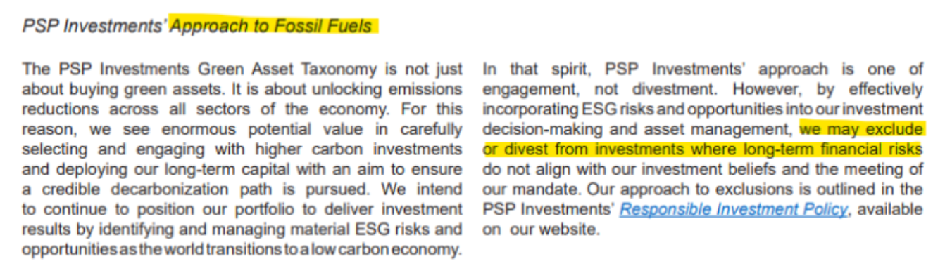 We are pleased to see PSP open the door to fossil fuel divestment in its 2022 RI Report. It noted that “We may also exclude or divest from investments where long-term financial risks do not align with our investment beliefs and the meeting of our mandate,” using its divestment of Russian assets as an example (RI Report, p.24). PSP also includes its “Approach to Fossil Fuels” in its Green Asset Taxonomy White Paper (p.12).