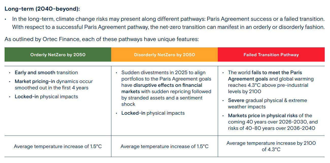 “In general, for all climate scenarios considered, investors should expect lower returns as compared to a world in which systemic climate change does not exist given that both physical and transition risk are likely not fully “priced-in” by financial market participants. However, a net zero transition scenario – even a disorderly one – enables global economies to stabilize once the transition has been completed. This demonstrates the need for investors to actively engage with companies and sovereigns to develop credible transition plans.”