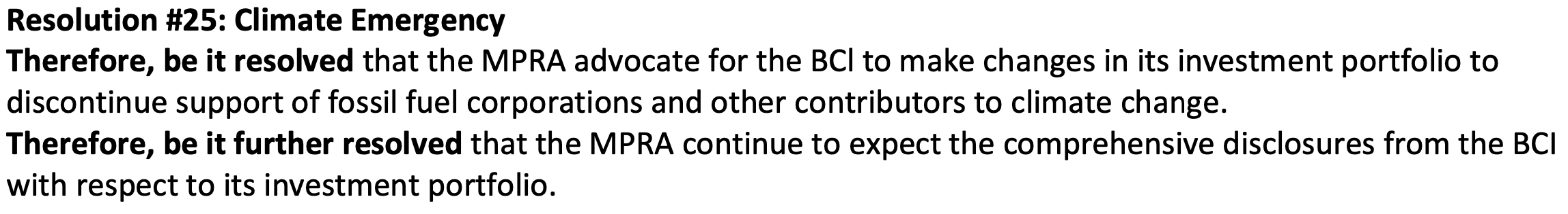 The resolution passed by the Municipal Pension Retirees Association on May 7, 2025.
