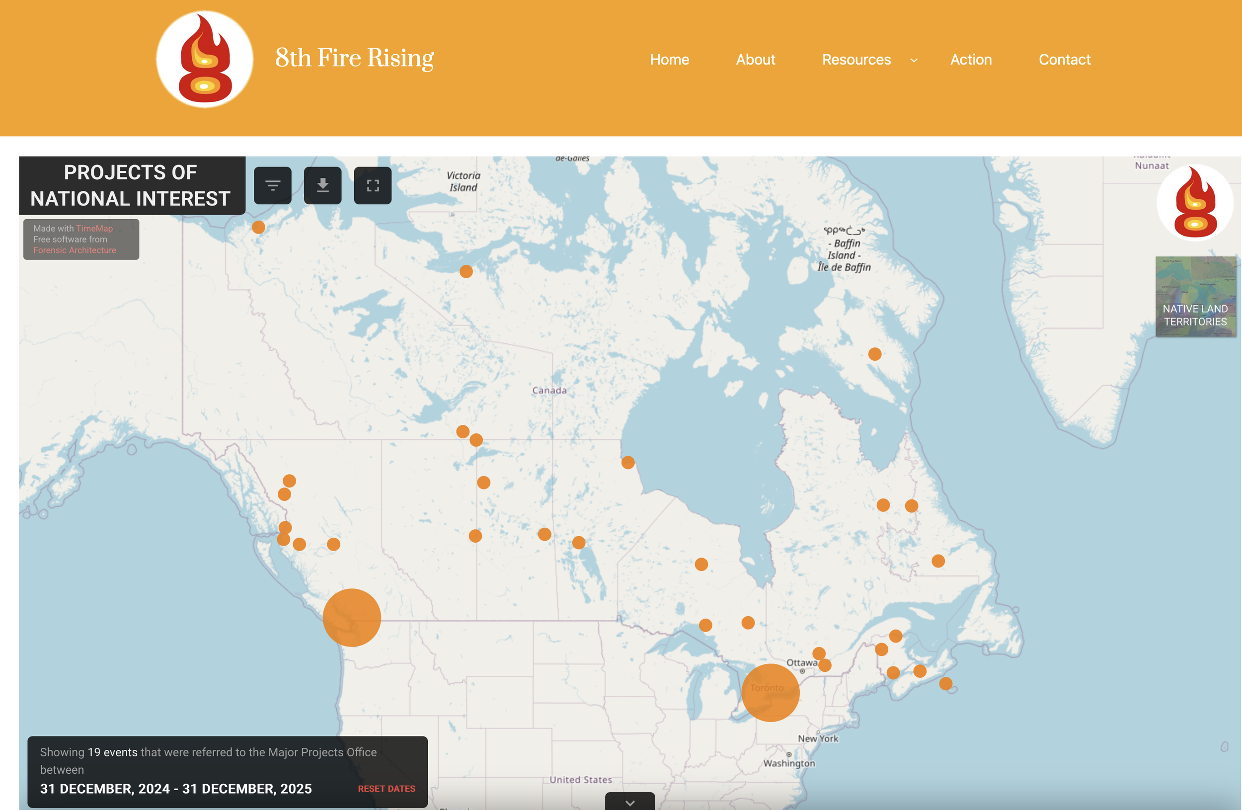 Map of projects of national interest referred to the Major Projects Office as of April 1, 2026, mapped by 8th Fire Rising, an Indigenous-led coalition of concerned and impacted communities.