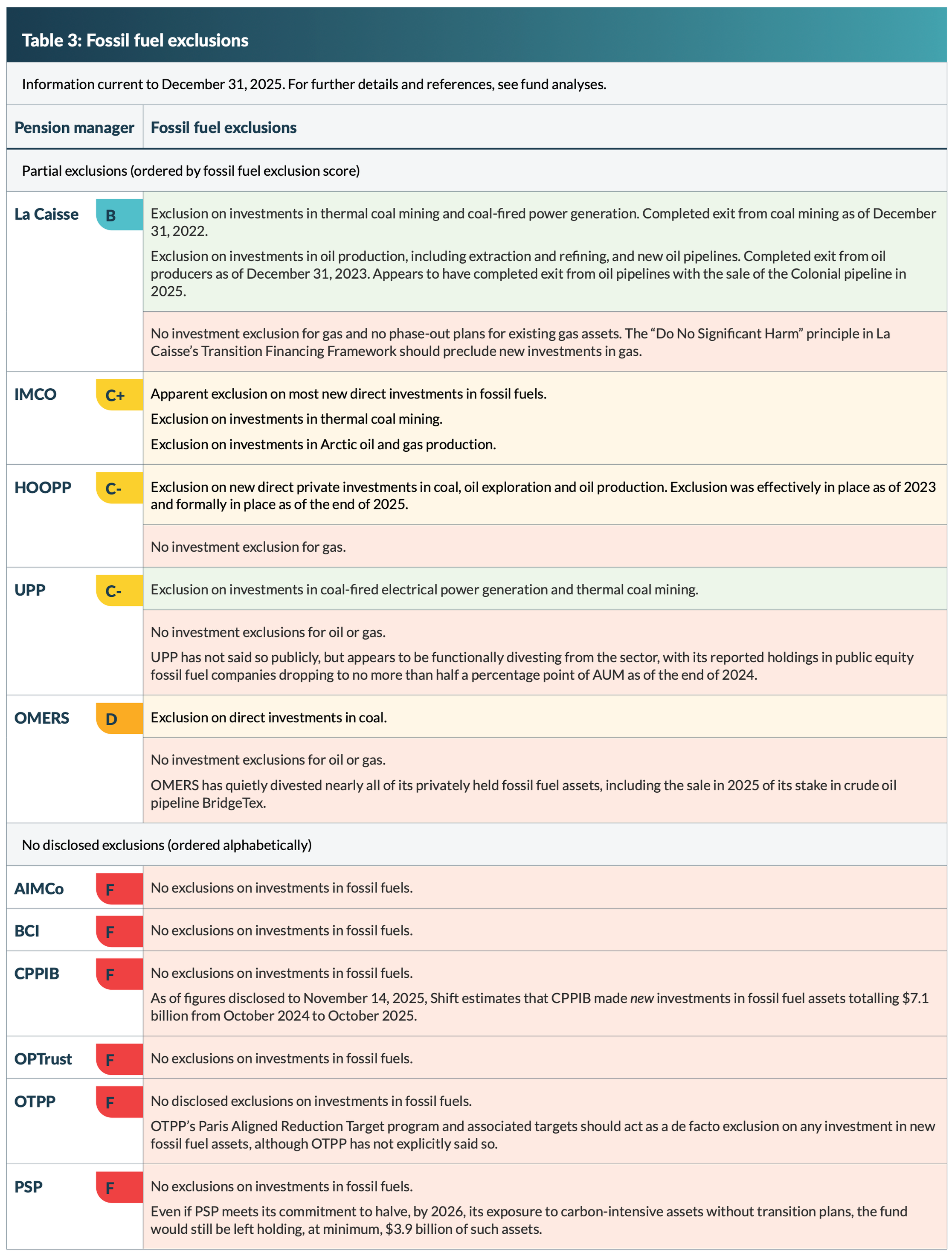As part of the 2025 Canadian Pension Climate Report Card, Shift identified the emissions reduction targets, additional climate targets, fossil fuel exclusions, fossil fuel investments and Indigenous rights policies of 11 Canadian pension managers. Fossil fuel exclusions (or lack thereof) appear below.